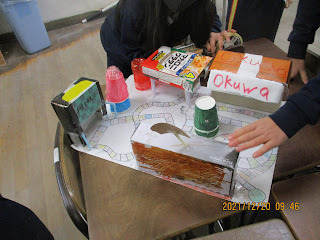 オリンピック競技場があります。背の高い建物はあべのハルカスだそうです。 いろんなグループのサイコロゲームをたっぷり楽しみました。 このグループは黒石方面に校区たんけんに行ったポイントを上手に表現できていました。3時間目は1年生の教室に行きました。